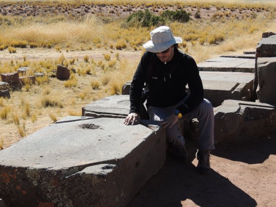 Arriba: Ricardo González examinando uno de los gigantescos bloques de piedra de Puma Punku.